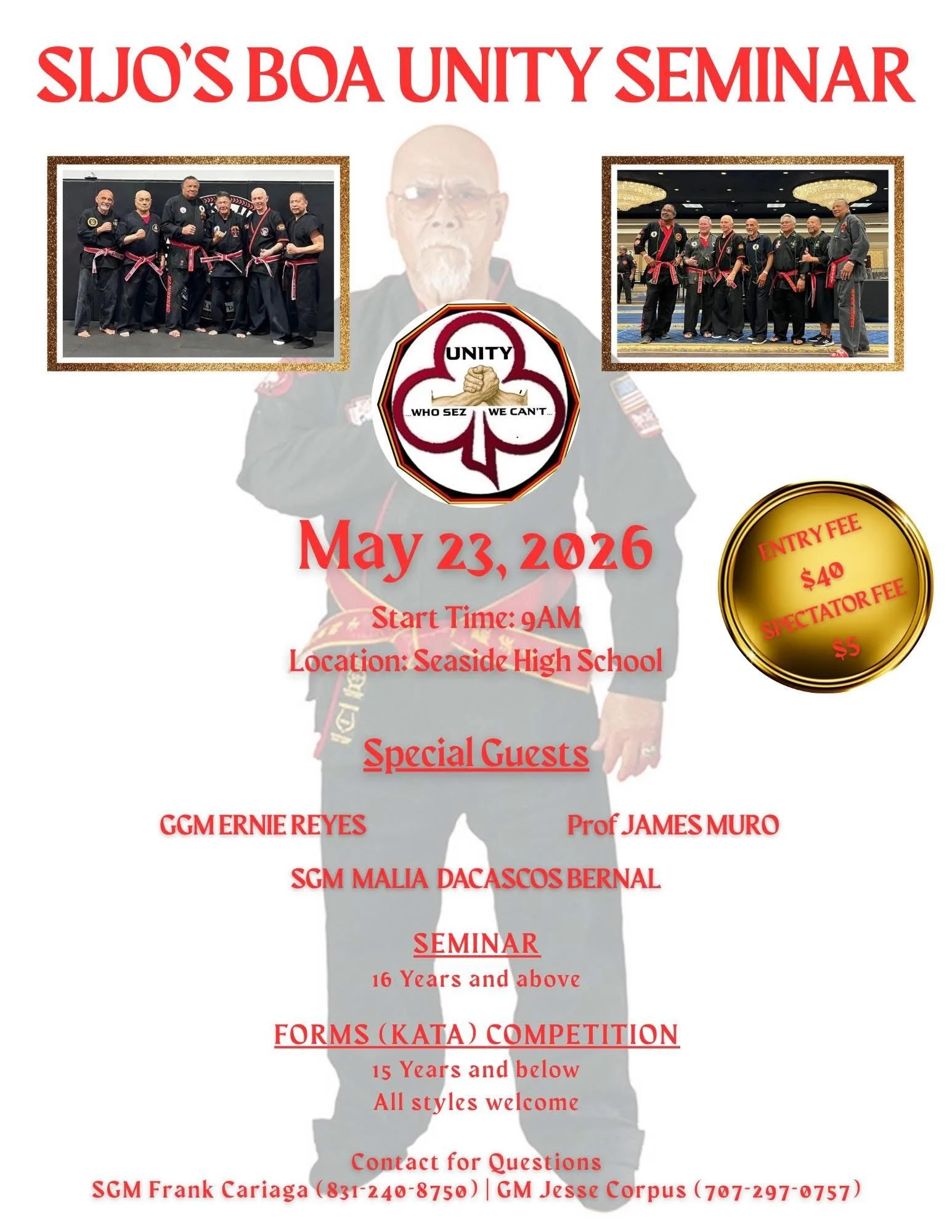 Sijo's Boa Unity Seminar May 23, 2026 Saturday, May 23, 2026 9:00 AM 4:00 PM 09:00 16:00 Dragons Den MMA 2801 Whipple Road Union City, CA, 94587 United States (map) Google Calendar ICS